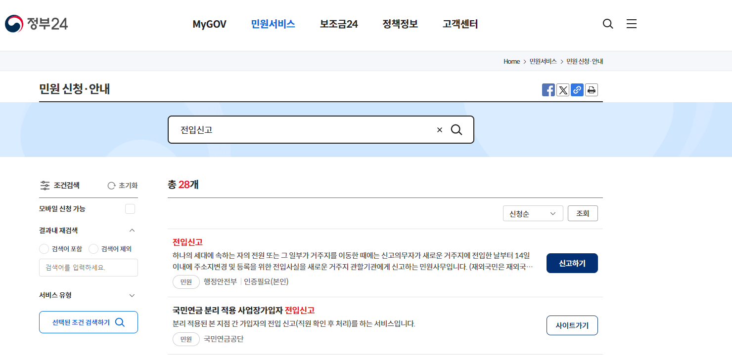 전입신고는 정부24 포탈사이트에 접속하셔서 검색창에 전입신고로 검색을하시면